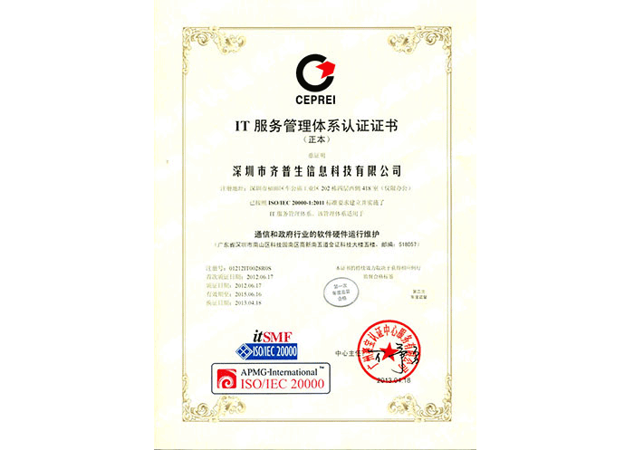ISO/IEC 20000 IT服务管理体系认证证书